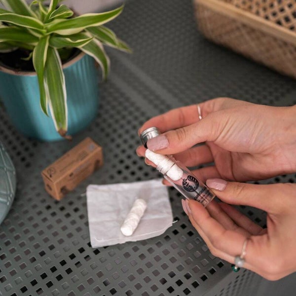 PRAKTISCH: De natuurlijke tandzijde van 2 x 30 meter kan in onze glazen flacon worden opgeborgen. Perfect voor onderweg, want de plasticvrije tandzijde past in elke broekzak of handtas.